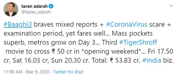 बॉलीवुड डेस्क. 'बागी 3' ने तीन दिन में घरेलू बॉक्स ऑफिस पर 50 करोड़ रुपए की कमाई का आंकड़ा पार कर लिया है। देश में चल रहे कोरोनावायरस के खौफ और परीक्षाओं के दौर के बावजूद फिल्म जबर्दस्त परफॉर्म कर रही है। ट्रेड एनालिस्ट तरन आदर्श के ट्वीट के मुताबिक, अहमद खान के निर्देशन में बनी 'बागी 3' ने शुक्रवार को 17.50 करोड़, शनिवार को 16.03 करोड़ रुपए के कलेक्शन के बाद रविवार फिल्म ने 20.30 करोड़ रुपए की कमाई की। तीन दिन का कुल कलेक्शन 53.83 करोड़ हो गया है।