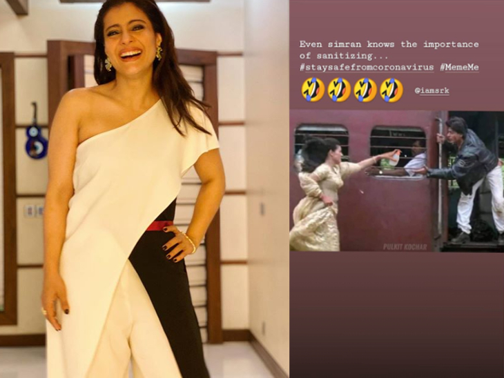 डीडीएलजे पर बना मीम: काजोल ने जिस मीम को शेयर किया है उसे 'दिलवाले दुल्हनिया ले जाएंगे' के क्लासिक सीन पर बनाया गया है। इस सीन में सिमरन (फिल्म में काजोल का किरदार) ट्रेन पर चढ़ने के लिए शाहरुख खान का हाथ पकड़ने के लिए भागती दिख रही हैं लेकिन कोरोनावायरस के चलते उनके हाथ में फोटोशॉप से सैनिटाइजर पकड़ा दिया गया है जिसे वह शाहरुख को देती नजर आ रही हैं। काजोल ने इस मीम को शेयर करते हुए लिखा, यहां तक कि सिमरन भी जानती है कि सैनिटाइजिंग कितनी जरुरी है।