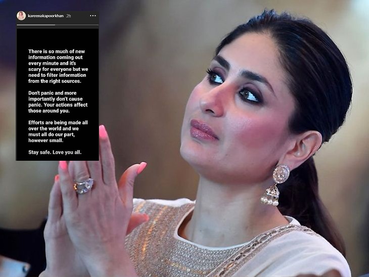 बॉलीवुड डेस्क. कोरोनावायरस से बचने के लिए कई बॉलीवुड स्टार्स सोशल मीडिया के जरिए लोगों को सावधानी बरतने के मैसेज दे चुके हैं। अब करीना कपूर ने इस महामारी से जुड़ी एक महत्वपूर्ण पोस्ट अपनी इंस्टाग्राम स्टोरी में शेयर की है। जिसमें उन्होंने लोगों से इस वायरस की रोकथाम के लिए बताए जा रहे उपायों को जांच-परखने के बाद ही अपनाने की सलाह दी है।