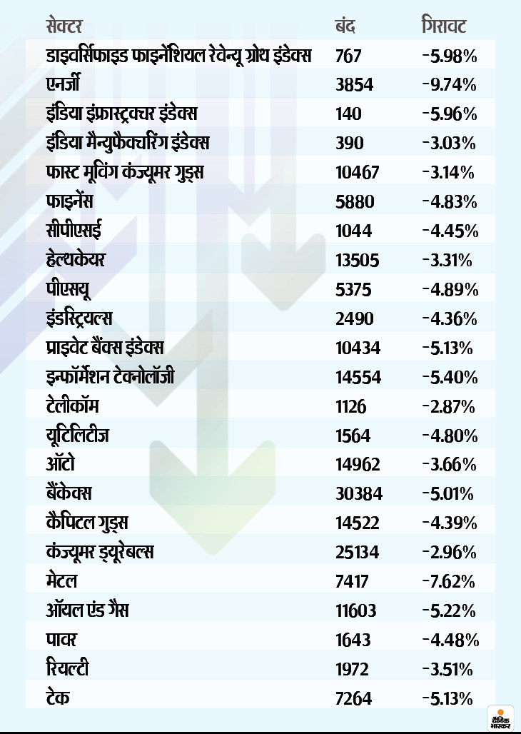 दूसरी तरफ, डाइवर्सिफाइड फाइनेंशियल रेवेन्यू ग्रोथ इंडेक्स, एनर्जी, इंडिया इंफ्रास्ट्रक्चर इंडेक्स, इंडिया मैन्युफैक्चरिंग इंडेक्स, फास्ट मूविंग कंज्यूमर गुड्स, फाइनेंस, सीपीएसई, हेल्थकेयर, प्राइवेट बैंक्स इंडेक्स, इन्फॉर्मेशन टेक्नोलॉजी, टेलीकॉम, यूटिलिटीज, ऑटो, बैंकेक्स, कैपिटल गुड्स, कंज्यूमर ड्यूरेबल्स, मेटल, ऑयल एंड गैस, पावर, रियल्टी समेत लगभग सभी सेक्टर में गिरावट देखने को मिलगी। एनर्जी सेक्टर जहां -9.74% गिरावट के साथ 3854 अंकों पर बंद हुआ, तो टेलीकॉम सेक्टर -2.87% की गिरावट के साथ 1126 पर बंद हुआ।
