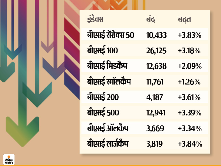 बाजार के बढ़ने से बीएसई के सभी इंडेक्स में 1 से 4 प्रतिशत तक की बढ़त देखने को मिली। बीएसई लार्जकैप जहां +3.84% की बढ़त के साथ 3,819 अंकों पर बंद हुआ। तो बीएसई सेंसेक्स 50 +3.83% की बढ़त के साथ 10,433 अंको पर बंद हुआ। वहीं, बीएसई 200 भी +3.61% की बढ़त के साथ 4,187 अंकों पर बंद हुआ।