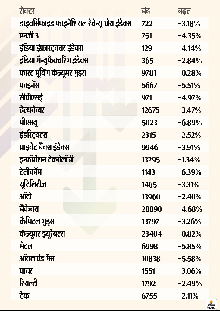 दूसरी तरफ, डाइवर्सिफाइड फाइनेंशियल रेवेन्यू ग्रोथ इंडेक्स, एनर्जी, इंडिया इंफ्रास्ट्रक्चर इंडेक्स, इंडिया मैन्युफैक्चरिंग इंडेक्स, फास्ट मूविंग कंज्यूमर गुड्स, फाइनेंस, सीपीएसई, हेल्थकेयर, प्राइवेट बैंक्स इंडेक्स, इन्फॉर्मेशन टेक्नोलॉजी, टेलीकॉम, यूटिलिटीज, ऑटो, बैंकेक्स, कैपिटल गुड्स, कंज्यूमर ड्यूरेबल्स, मेटल, ऑयल एंड गैस, पावर, रियल्टी समेत लगभग सभी सेक्टर में भी बढ़त रही। पीएसयू सेक्टर सबसे ज्यादा +6.89% की बढ़त के साथ 5023 अंकों पर बंद हुआ, तो मेटल सेक्टर +5.85% की बढ़त के साथ 6998 अंकों पर बंद हुआ।