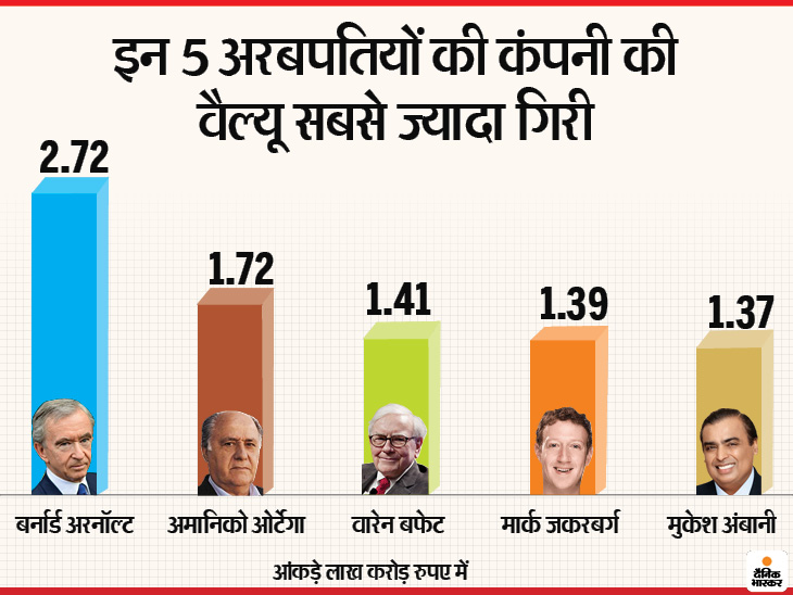 आरआईएल का वैल्यूशन 1.37 लाख करोड़ रुपए कम होने के बाद मुकेश अंबानी सबसे ज्यादा नुकसान झेलने वाले दुनिया के पांचवें व्यक्ति बन गए। पहले स्थान पर अरबपति बर्नार्ड अरनॉल्ट रहे, जिनकी नेटवर्थ 2.72 लाख करोड़ रुपए कम हुई। दूसरे पर अमानिको ओर्टेगा रहे, जिनकी नेटवर्थ 1.72 लाख करोड़ रुपए कम हुई। तीसरे पर वॉरेन बफेट रहे, जिनकी नेटवर्थ 1.41 लाख करोड़ कम हुई। चौथे स्थान पर फेसबुक के मार्क जकरबर्ग रहे, जिनकी नेटवर्थ 1.39 लाख करोड़ रुपए कम हो गई।