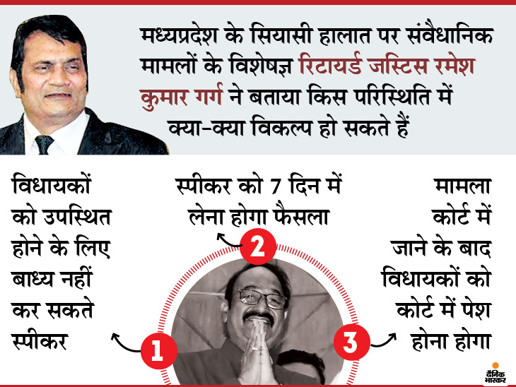 - स्पीकर सदस्यों को अयोग्य ठहरा सकते हैं, लेकिन यह अयोग्यता 6 महीने से ज्यादा वक्त के लिए लागू नहीं होगी। कर्नाटक के 17 बागी विधायकों के केस में अयोग्य ठहराए जाने के बावजूद सुप्रीम कोर्ट ने उन्हें चुनाव लड़ने की छूट दे दी थी। वह आदेश मप्र की परिस्थितियों पर भी लागू होगा।