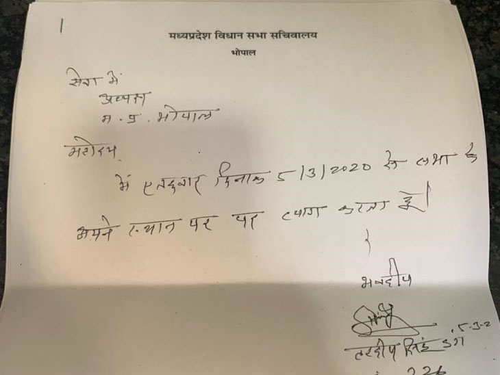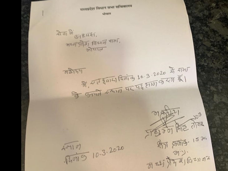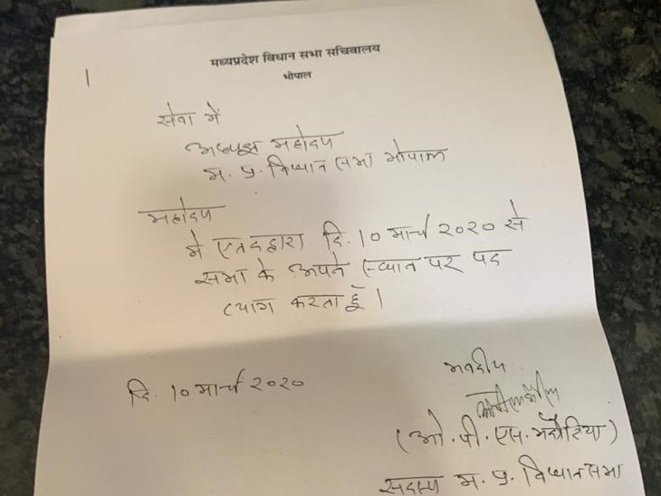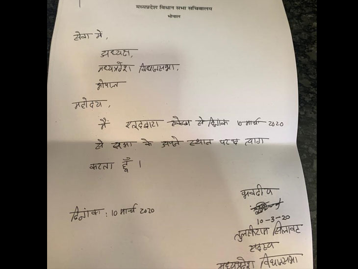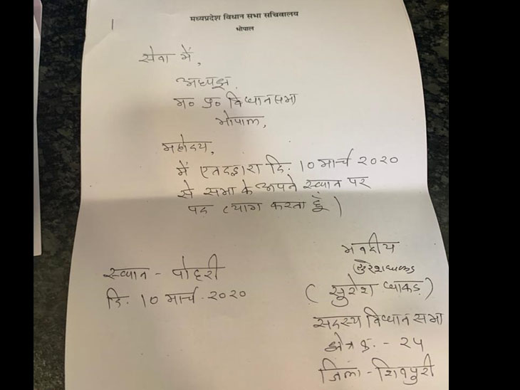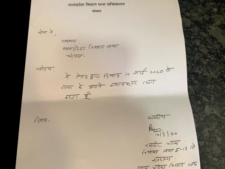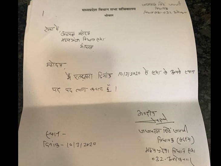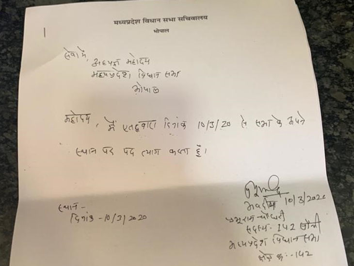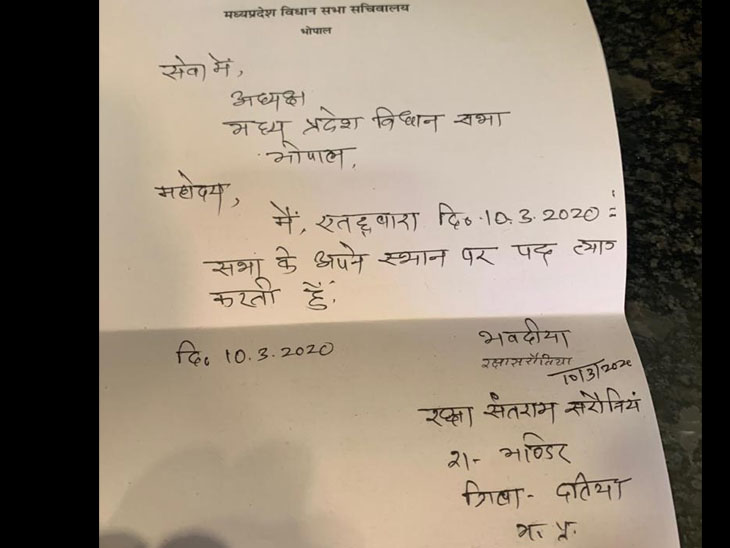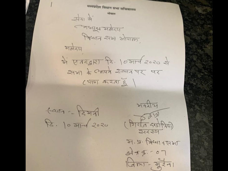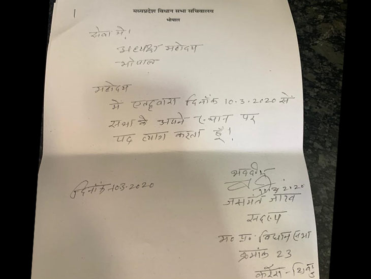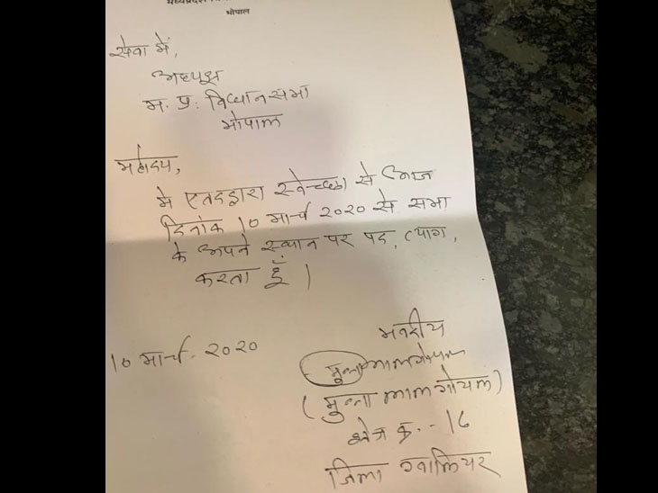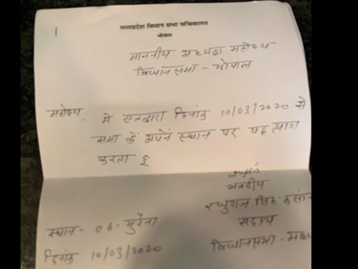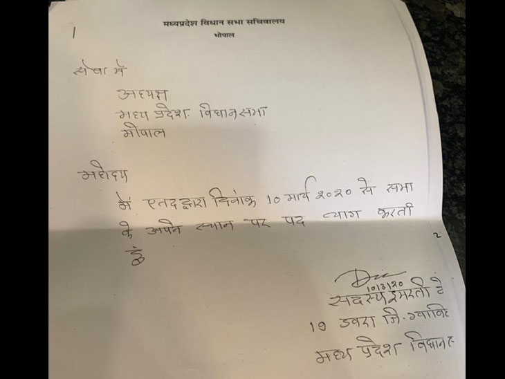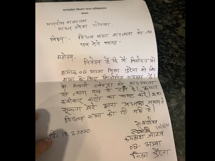 कमलेश जाटव ने अपने इस्तीफे में एक से ज्यादा पंक्तियां लिखीं। उन्होंने लिखा- ‘मैं निर्वाचन क्रमांक 8 अम्बा जिला मुरैना से विधानसभा के लिए निर्वाचित सदस्य हूं। मैं अपनी स्वेच्छा से सदस्यता से त्याग-पत्र दे रहा हूं। कृपया स्वीकार करने का कष्ट करें। यह सूचना मेरे द्वारा अध्यक्ष मध्यप्रदेश विधानसभा को दी गई है।’