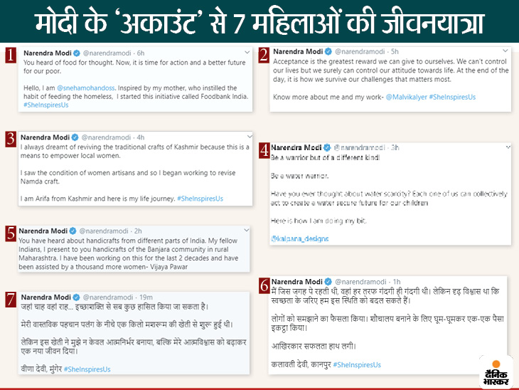 प्रधानमंत्री नरेंद्र मोदी ने 8 मार्च यानी महिला दिवस के दिन अपने सोशल मीडिया अकाउंट्स उन महिलाओं को सौंपने का फैसला किया था, जो दूसरों के लिए प्रेरणा है। इस फैसले के बाद ही मोदी ने लोगों से अपील की थी कि वे #SheInspiresUs पर ऐसी महिलाओं के किस्से साझा करें, जो दूसरों के लिए प्रेरणा हैं।