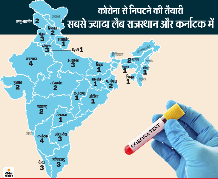 कोरोनावायरस के संक्रमण की जांच के लिए देशभर में 52 लैब बनाई गई हैं। इंडियन काउंसिल ऑफ मेडिकल रिसर्च (आईसीएमआर) ने स्वास्थ्य और शोध विभाग के साथ मिलकर ये लैब बनाई हैं। आईसीएमआर के मुताबिक, दिल्ली के लेडी हार्डिंग मेडिकल कॉलेज समेत देश के अलग-अलग स्थानों पर वायरस रिसर्च एंड डॉयग्नॉस्टिक लैब (वीआरडी) नमूने एकत्रित कर रही हैं। 6 मार्च तक 3,404 लोगों के 4,058 सैंपल की जांच की जा चुकी है। इनमें चीन के वुहान शहर से लाए गए 654 लोगों के 1,308 सैंपल भी शामिल हैं।