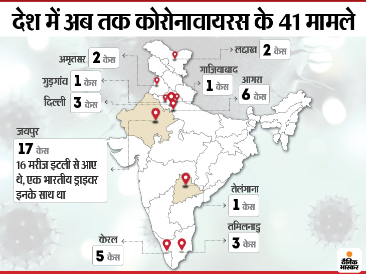 नई दिल्ली. भारत में कोरोनावायरस के अब तक 41 मामले सामने आ चुके हैं। केरल में रविवार को पांच नए मरीजों में संक्रमण पाया गया। इनमें से तीन मरीज हाल ही में इटली से लौटे थे। केरल सरकार ने चेतावनी दी है कि ट्रैवल हिस्ट्री की जानकारी न देने वालों पर एक्शन लिया जाएगा। तमिलनाडु में भी एक व्यक्ति पॉजिटिव पाया गया है। यहां शनिवार को भी ओमान से लौटे एक व्यक्ति में संक्रमण पाया गया था। इस बीच, अरुणाचल प्रदेश सरकार ने राज्य में विदेशी यात्रियों के आने पर प्रतिबंध लगा दिया है। विदेशियों को यहां आने के लिए प्रोटेक्टेड एरिया परमिट (पीएपी) लेना होता है, जिस पर पाबंदी लगा दी गई है।