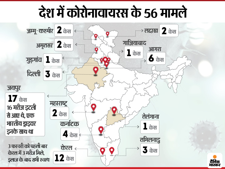 नई दिल्ली. कोरोनावायरस के केरल में मंगलवार को 6 और कर्नाटक में 3 नए मामले सामने आए। देश में कुल 56 मामलों की पुष्टि हो चुकी है। इससे पहले सोमवार देर रात पुणे में 2 व्यक्तियों में संक्रमण का मामला सामने आया था। दोनों को वहां के नाएडू अस्पताल में भर्ती कराया गया है। उधर, वायुसेना का विमान सी-17 ग्लोबमास्टर मंगलवार सुबह ईरान से 58 भारतीय नागरिकों के पहले जत्थे को लेकर गाजियाबाद के हिंडन एयरफोर्स स्टेशन पहुंचा। विमान सोमवार को रवाना हुआ था। ईरान से लाए गए सभी नागरिक धार्मिक यात्रा पर गए थे। सभी नागरिक एयरबेस पर 14 दिनों तक निगरानी में रहेंगे।