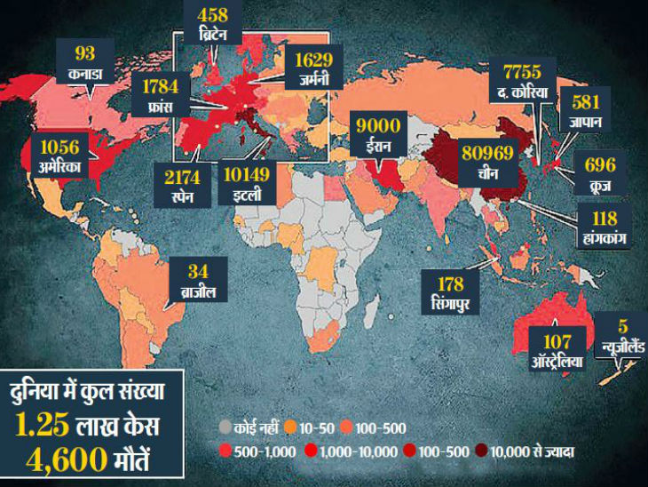 72 दिनों में 6 महाद्वीपों के 120 देशों में पहुंचा संक्रमण; अब तक 4600 मौतें, 1.25 लाख से ज्यादा चपेट में आए