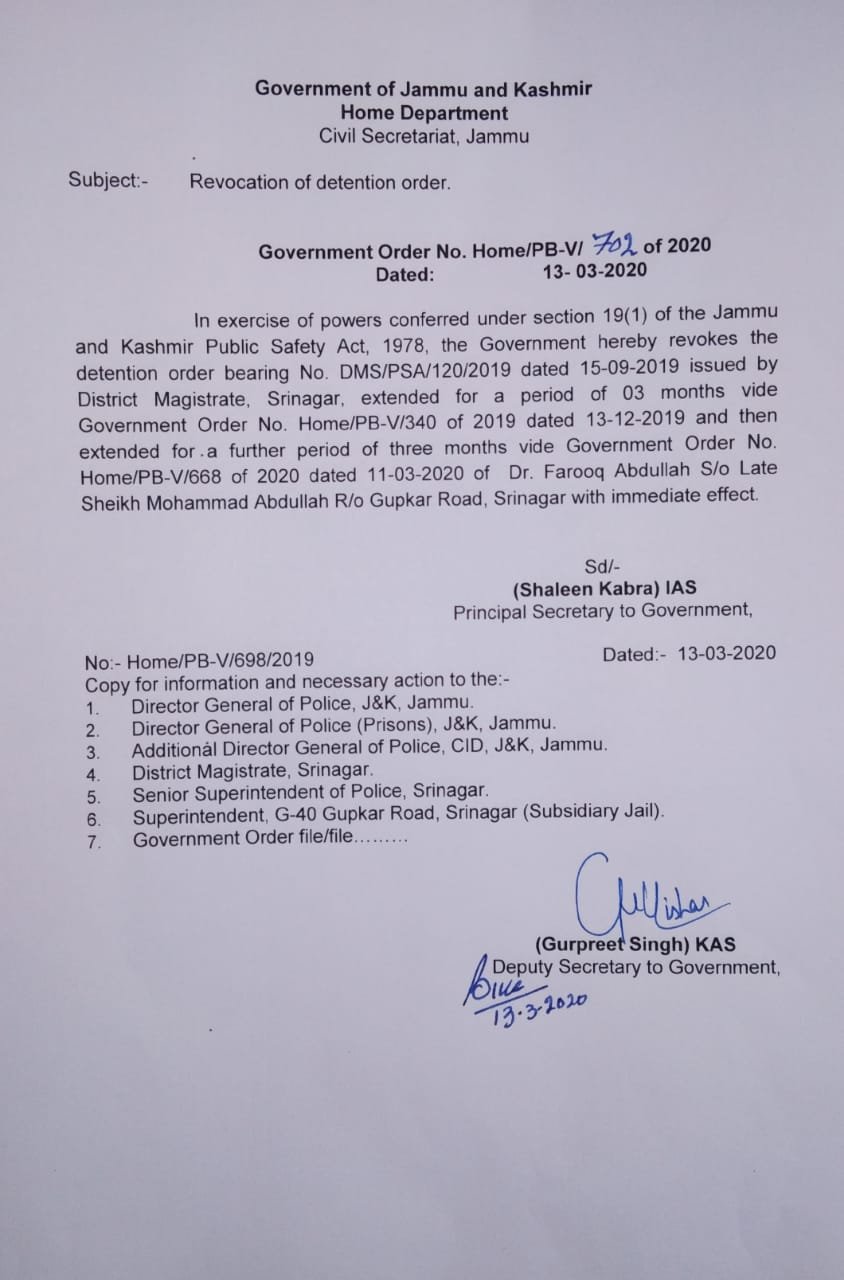 रिहाई के बाद फारूक ने अपने घर पर मीडिया को बुलाया। उन्होंने कहा- मेरी आजादी तब तक अधूरी है, जब तक उमर अब्दुल्ला, महबूबा मुफ्ती व अन्य नेताओं की रिहाई नहीं हो जाती। उम्मीद है भारत सरकार अब उन सभी को रिहा करेगी, जिन्हें राजनीतिक हिरासत में लिया गया था। मैं उन सभी का शुक्रिया करता हूं, जिन्होंने मेरी रिहाई के लिए दुआएं की हैं।