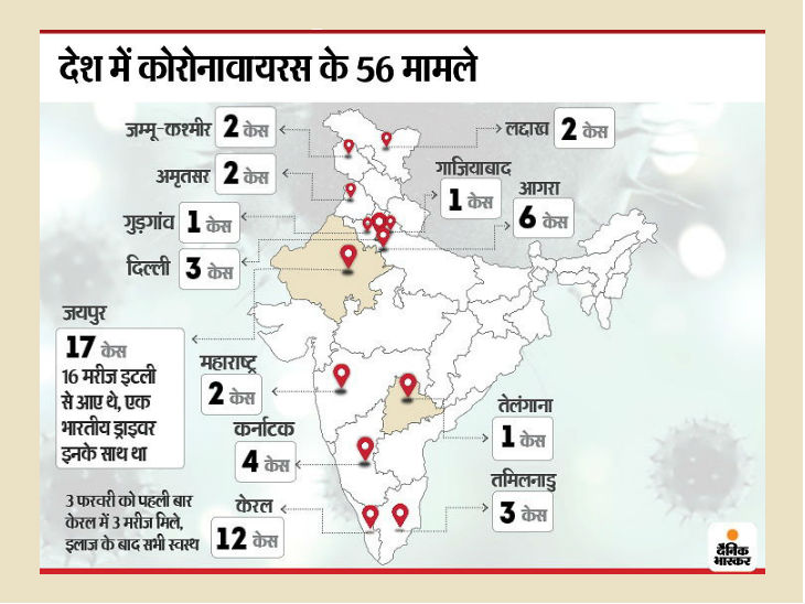 केरल में मंगलवार को कोरोनावायरस के 6 और कर्नाटक में 3 नए केस सामने आए। देश में कुल 56 मामलों की पुष्टि हो चुकी है। केरल में सातवीं तक की कक्षाएं और परीक्षाएं 31 मार्च तक स्थगित कर दी गई हैं। 31 मार्च तक ट्यूशन क्लास, आंगनवाड़ी, मदरसे भी बंद कर दिए गए हैं। उधर, वायुसेना का विमान सी-17 ग्लोबमास्टर मंगलवार सुबह ईरान से 58 भारतीय नागरिकों के पहले जत्थे को लेकर गाजियाबाद के हिंडन एयरफोर्स स्टेशन पहुंचा।