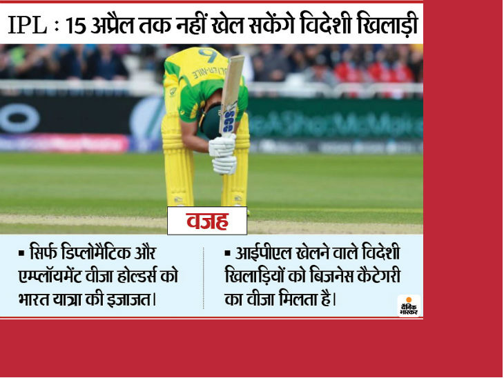 कोरोनावायरस का असर 29 मार्च से शुरू हो रहे आईपीएल पर भी पड़ना तय है। केंद्र सरकार ने विदेश से आने वाले लोगों पर रोक लगा दी है। 13 मार्च से 15 अप्रैल तक के लिए सभी वीजा रद्द कर दिए गए हैं। सिर्फ डिप्लोमैटिक और एम्प्लॉयमेंट वीजा को ही मंजूरी दी गई है। खिलाड़ियों को बिजनेस वीजा मिलता है। ऐसे में उन्हें भी देश में आने की अनुमति नहीं होगी। आईपीएल के 8 टीमों में कुल 65 विदेशी खिलाड़ी हैं। इनमें से कोई भी अब 15 अप्रैल तक भारत नहीं आ पाएगा।