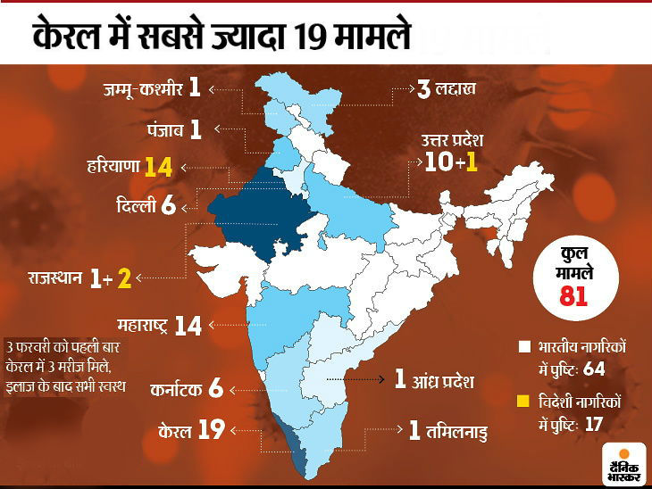 देश में कोरोनावायरस के मामलों की संख्या गुरुवार को 81 हो गई है। केंद्रीय स्वास्थ्य मंत्रालय के मुताबिक, इसमें भारत के 64, इटली के 16 और कनाडा का एक व्यक्ति शामिल है। दिल्ली सरकार ने कहा कि अगर कोई संक्रमित या संदिग्ध इलाज से इनकार करता है तो उस पर एक्शन लिया जाएगा। इस बीच, कोरोनावायरस से बुरी तरह प्रभावित ईरान से 44 भारतीयों को लेकर एयर इंडिया का विमान शुक्रवार को मुंबई पहुंचा। इन सभी लोगों को आइसोलेशन में रखा जाएगा।