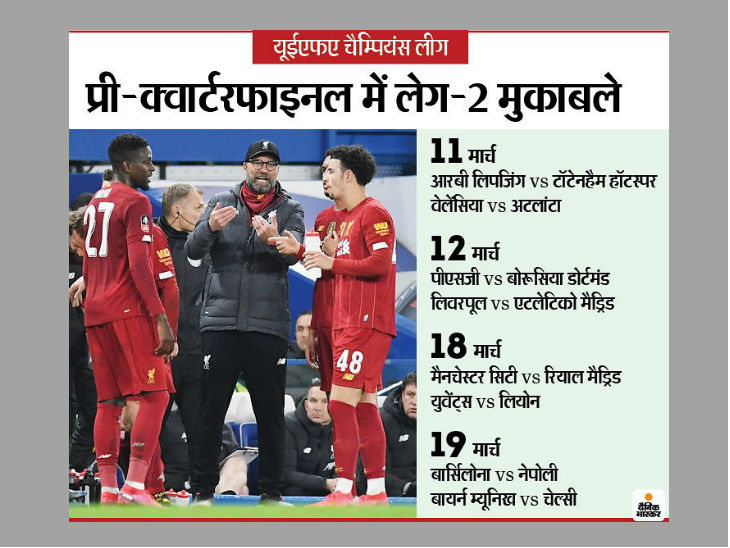यूईएफए चैम्पियंस लीग के प्री-क्वार्टरफाइनल में लेग-2 के मुकाबले 11 मार्च से शुरू हो रहे हैं। इस राउंड में 16 टीमों के बीच 8 मैच होंगे। डिफेंडिंग चैम्पियन लिवरपूल पर बाहर होने का खतरा है, क्योंकि उसे पहले लेग मुकाबले में स्पेनिश क्लब एटलेटिको मैड्रिड ने 1-0 से हराया था। चैम्पियंस लीग में होम और अवे गोल, अगले चरण में पहुंचने में बड़ा रोल निभाते हैं। होमग्राउंड में किया गया गोल होम गोल और दूसरी टीम के होमग्राउंड पर किया अवे गोल कहलाता है। अगर लिवरपूल 3-2 से भी अगला मैच जीता तो अवे गोल के कारण एटलेटिको को क्वार्टर फाइनल में एंट्री मिल जाएगी।