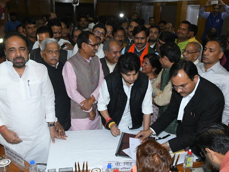 भाजपा में शामिल होने के 2 दिन बाद गुरुवार को ज्योतिरादित्य सिंधिया ने भोपाल में राज्यसभा के लिए नामांकन दाखिल कर दिया। विधानसभा में सिंधिया के नामांकन भरने के दौरान पूर्व मुख्यमंत्री शिवराज सिंह चौहान, केंद्रीय मंत्री नरेंद्र सिंह तोमर, राज्यसभा सांसद प्रभात झा, प्रदेश अध्यक्ष वीडी शर्मा, गोपाल भार्गव भी मौजूद रहे। इससे पहले, सिंधिया ने भाजपा नेताओं के साथ नरोत्तम मिश्रा के घर पर लंच किया।
