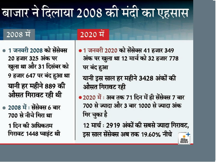 दुनिया के बाजारों में कोरोना महामारी फैल गई है। लग रहा है कि 2020 की मंदी 2008 की वैश्विक मंदी से बड़ी हो गई है। इस साल अब तक 71 दिन में ही सेंसेक्स 7 बार 700 से ज्यादा अंक गिर चुका है। 3 बार 1000 से ज्यादा अंक की गिरावट हुई है। 2008 की वैश्विक आर्थिक मंदी के दौर में 6 बड़ी गिरावटें 10 महीनों में हुई थीं। तब सालभर में एक हजार से ज्यादा अंकों की 2 ही गिरावट हुई थीं। सबसे ज्यादा 1408 प्वाइंट्स सेंसेक्स गिरा था।