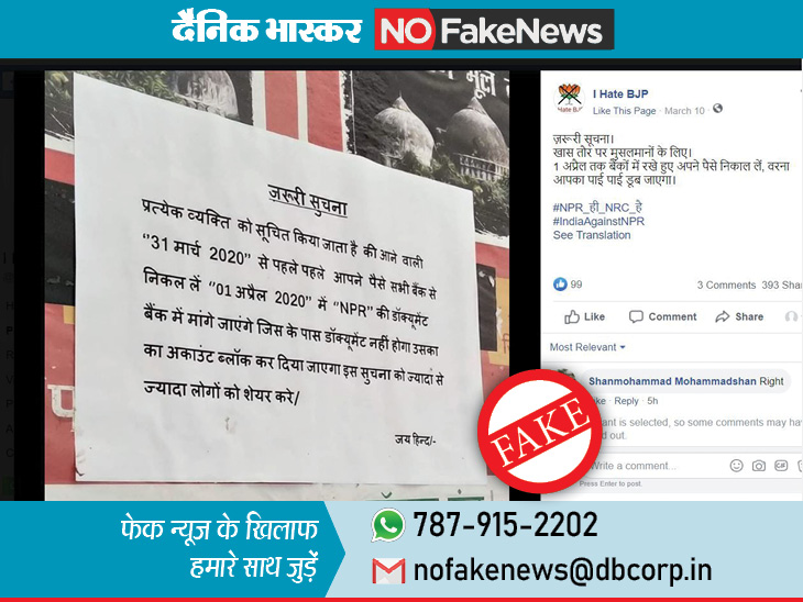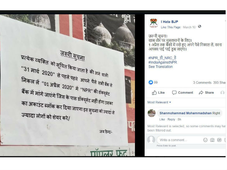 - सोशल मीडिया में वायरल स्क्रीनशॉट में लिखा है कि, 'प्रत्येक व्यक्ति को सूचित किया जाता है कि आने वाली 31 मार्च 2020 से पहले अपने सभी बैंक अकाउंट से पैसा निकाल लें। 1 अप्रैल 2020 से एनपीआर डॉक्युमेंट बैंक द्वारा मांगे जाएंगे, जिसके पास डॉक्युमेंट नहीं होगा उसका अकाउंट ब्लॉक कर दिया जाएगा। इस सूचना को ज्यादा से ज्यादा लोगों तक शेयर करें'।