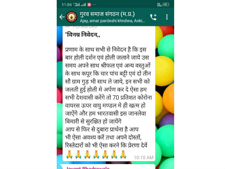 - सोशल मीडिया में वायरल मैसेज में लिखा है कि, 'इस बार होली दर्शन एवं होली जलाने जाएं उस समय अपने साथ श्रीफल एवं अन्य वस्तुओं के साथ कपूर कि चार-पांच बट्टी एवं दो-तीन सौ ग्राम गुड़ भी साथ ले जाएं, इन सभी को जलती हुई होली में अर्पण कर दें। ऐसा हम सभी देशवासी करेंगे तो 70 प्रतिशत कोरोना वायरस ऊपर वायुमंडल में ही खत्म हो जाएंगे और हम भारतवासी इस जानलेवा बिमारी से सुरक्षित हो जाएंगे।'