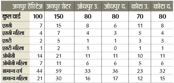 जयपुर के जिला निर्वाचन विभाग ने कलेक्ट्रेट सभागार में नगर निगम हैरिटेज व नगर निगम ग्रेटर के वार्डों की आरक्षण लॉटरी निकाली। जिला निर्वाचन अधिकारी व कलेक्टर डॉ. जोगाराम के निर्देश पर एडीएम-2 पुरुषोत्तम शर्मा ने लॉटरी निकाली। लॉटरी के दौरान भाजपा नेताओं ने परिसीमन को लेकर सवाल उठाए। कलेक्टर डॉ. जोगाराम, निगम प्रशासक विजय पाल सिंह, किशनपाल से कांग्रेस के विधायक अमीन कागजी और बगरू से विधायक गंगा देवी, बीजेपी विधायक कालीचरण सराफ, सांगानेर विधायक अशोक लाहोटी, विद्याधर नगर विधायक नरपत सिंह राजवी, निवर्तमान उपमहापौर मनोज भारद्वाज सहित बीजेपी प्रतिनिधि मौजूद रहे। नगर निगम क्षेत्र में 2011 की जनगणना की जनसंख्या के आधार पर लॉटरी निकाली गई। जयपुर नगर निगम हैरिटेज में ओबी के 21 वार्ड में से 7 वार्ड महिलाओं के लिए आरक्षित है। एससी के 11 वार्ड में से 4 महिलाओं के वार्ड है। एसटी के तीन वार्ड में से एक वार्ड महिलाओं के लिए और सामान्य के 65 वार्ड में से 21 वार्ड महिलाओं के लिए आरक्षित है। 1. ओबीसी वार्ड :- 1,6,7,9,13,14,17,29,37,48,64,69,73,95 ओबीसी महिला वार्ड :- 2,18,27,28,59,74,78 2. एससी वार्ड :- 8,57,62,66,77,84,96 एससी महिला वार्ड :- 40,82,97,99 3. एसटी वार्ड :-11, 100 एसटी महिला वार्ड :- 46 4. सामान्य वार्ड :- 3, 5,15,19,20,22,24,25,26,30,31,32,33,34,35,38,39,41,42,43,45,49,50,51, 55,58,60,65,67,70,71,75,76,80,83,86,87,88,89,90,91,93,94,98 सामान्य महिला वार्ड :- 4,10,12,16,21,23,36,44,47,52,53,54,56,61,63,68,72,79,81,85,92