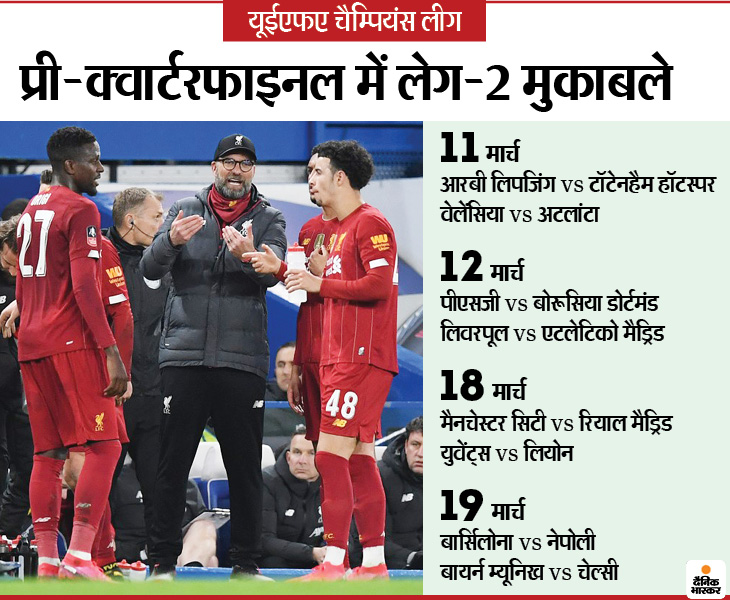 खेल डेस्क. यूईएफए चैम्पियंस लीग के प्री-क्वार्टरफाइनल में लेग-2 के मुकाबले 11 मार्च से शुरू हो रहे हैं। इस राउंड में 16 टीमों के बीच 8 मैच होंगे। डिफेंडिंग चैम्पियन लिवरपूल पर बाहर होने का खतरा मंडरा रहा है, क्योंकि इंग्लिश टीम को पहले लेग मुकाबले में स्पेनिश क्लब एटलेटिको मैड्रिड ने 1-0 से हराया था। लिवरपूल के लिए सबसे बड़ी परेशानी यह है कि वह एटलेटिको के होम ग्राउंड पर हुए इस मुकाबले में वह एक भी गोल नहीं कर सका।