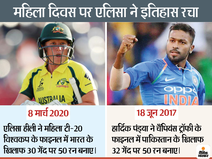 खास बात ये है कि एलिसा ने भारतीय महिला टीम के खिलाफ भारत के ही हार्दिक पंडया का रिकॉर्ड तोड़ा। 2017 में हार्दिक ने चैंपियंस ट्रॉफी के फाइनल में पाकिस्तान के खिलाफ 32 बॉल पर 50 रन बनाए थे। एलिसा ने यह तूफानी पारी अपने होम ग्राउंड पर 80 हजार दर्शकों के सामने खेली। इन दर्शकों में उनके जीवनसाथी मिशेल स्टार्क भी थे। ऑस्ट्रेलियाई पुरुष टीम के कोच जस्टिन लैंगर ने मिशेल को खास तौर पर पत्नी एलिसा का मैच देखने की मंजूरी दी थी। हालांकि, ऑस्ट्रेलियाई टीम दक्षिण अफ्रीका के खिलाफ वनडे सीरीज 3-0 से हार चुकी है। आखिरी वनडे शनिवार को खेला गया। मिशेल शुक्रवार को ही दक्षिण अफ्रीका से स्वदेश रवाना हो चुके थे।