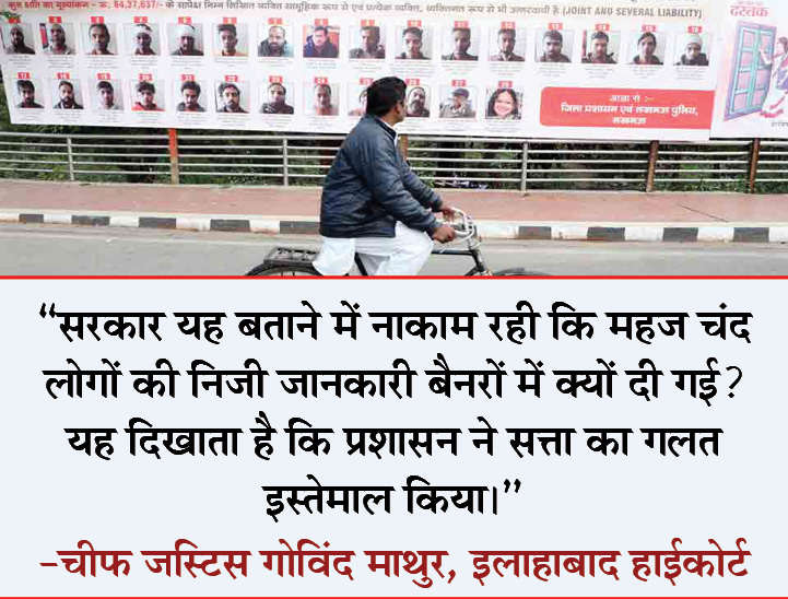 हाईकोर्ट ने रविवार को सुनवाई के दौरान कहा था- कथित सीएए विरोधी प्रदर्शनकारियों के पोस्टर लगाने की सरकार की कार्रवाई बेहद अन्यायपूर्ण है। यह संबंधित लोगों की आजादी का हनन है।ऐसा कोई कार्य नहीं किया जाना चाहिए, जिससे किसी के दिल को ठेस पहुंचे। पोस्टर लगाना सरकार के लिए भी अपमान की बात है और नागरिक के लिए भी। किस कानून के तहत लखनऊ की सड़कों पर इस तरह के पोस्टर लगाए गए? सार्वजनिक स्थान पर संबंधित व्यक्ति की इजाजत के बिना उसका फोटो या पोस्टर लगाना गलत है। यह निजता के अधिकार का उल्लंघन है।