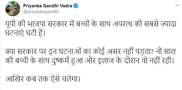 लखनऊ. कांग्रेस की महासचिव व उत्तर प्रदेश की प्रभारी प्रियंका गांधी वाड्रा ने एक बार फिर कानून-व्यवस्था के मुद्दे पर योगी सरकार को घेरा है। प्रियंका ने बुधवार को ट्वीट कर कहा कि 'यूपी की भाजपा सरकार में बच्चों के साथ अपराध की सबसे ज्यादा घटनाएं घटी हैं। क्या सरकार पर इन घटनाओं का कोई असर नहीं पड़ता? नौ साल की बच्ची के साथ दुष्कर्म हुआ और इलाज के दौरान वह नहीं रही। आखिर कब तक ऐसे चलेगा।'